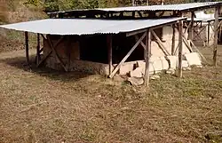 Already in the late 1960s, a destroyed kiln and building remains had been discovered.[2] Other structures were destroyed by dredging, while parts of a burial chamber were noticed.[3] The tomb A is one of the earliest known examples of Macedonian tombs.[4] Because of the design the grave is regarded as a transitional form from the cist graves to the Macedonian tombs. The excavations were carried out in May 1977. The discovery of a coin from the time Amyntas III allows dating of the tomb in the 2nd quarter of the 4th century BC.[5] Both tombs were built from precisely manufactured limestone monoliths, plastered and painted inside. The graves were covered flat, they have neither access (Dromos) nor the usual vaulted ceiling. In both graves, the stone roof construction was partially removed, so that one has a good view from above. Access to the graves is not possible. A metal cover protects the structures from weathering.