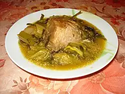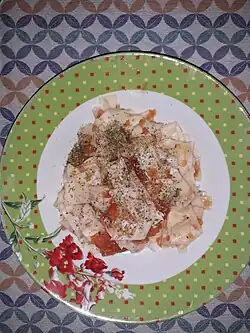 Macedonian cuisine (Greek: Μακεδονική κουζίνα)[1][2][3][4][5] is the cuisine of the region of Macedonia, Greece.[6][7] Contemporary Greek Macedonian cooking shares much with general Greek, wider Balkan and Mediterranean cuisine, including dishes from the Ottoman past. Specific influences include dishes of the Anatolian Greek, Aromanian and Megleno-Romanian, Slavic, Armenian and Sephardi Jewish population.[8][9] The mix of the different people inhabiting the region gave the name to the Macedonian salad.