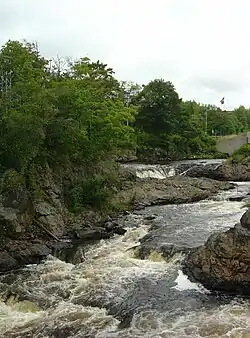 The name is believed to derive from a Passamaquoddy word meaning "bad run of water" or "bad little falls", either of which does describe the difficulty of canoeing some of the rapids in the river.[4][5] The river was used as a seasonal migration route by Indians.[4] The first European settlement is believed to have been an English trading post in 1633, almost immediately destroyed by the French. The first permanent settlement in the area in 1763 was intended to be a site for the production of lumber, with 1.6 million board feet produced in 1764. The river mouth and offshore waters were the scene of the Battle of Machias — the first naval battle of the American Revolution, occasioned by the British need for lumber for Boston.[6] Lumber remained a main industry along the river, with the river powering the sawmills. Production was as high as 40 million feet in a year, but declined in the late 19th century to between 10 and 20 million feet per year (with a similar amount of lath also produced). The woods cut were originally pine, and later also hemlock and spruce.[7] Natural water flow in the river varies seasonally, so dams were built to power the mills. The last dam was breached in 1973, and fully removed in 2000.[4][8][9]