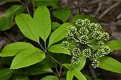 Mackinlaya macrosciadea is an evergreen shrub growing up to 3–5 m tall (10–16 ft), usually unbranched. The compound leaves are held on petioles up to 15 cm (6 in) long, with 3–7 leaflets arranged around a common attachment point (i.e. they are palmate). The leaflets are glabrous (without hairs), measure up to 18 cm (7 in) long and 6 cm (2.4 in) wide, and their margins may be smooth, toothed or lobed.[4][5][6]