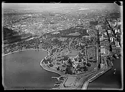 The northern section of Macquarie Street was initially a path through the Governor's Domain leading to Bennelong Point. After Government House was moved further up the hill, the path was widened and became part of Macquarie Street, leading to land to the west of the street being sold off for commercial development in the 1840s–1850s. Today, this northern section of Macquarie Street runs along the eastern side of Circular Quay. To the east of this northern section is the Royal Botanic Gardens, while to the west of the street, the historic sandstone Moore Stairs, built in 1868 leads to the waterfront.[7] In the past, this area was lined by warehouses and other shipping-related facilities focusing on the wool trade, leading to this section being called the "wool stores" end. In 1868 Moore Stairs were built to provide access between these stores down to East Circular Quay.[8] At the end of the street was Bennelong Point. From 1821 this was the site of Fort Macquarie, which in 1901 was demolished to make way for the Fort Macquarie Tram Depot, which was eventually demolished in 1958 to make way for the Sydney Opera House.