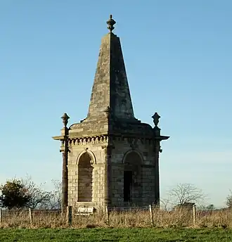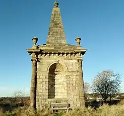 Located in a prominent position (NS 236541, 628257) on the lands of Whiteside Farm overlooking Monkton this Corinthian style memorial was built between 1748 and 1750 for James Macrae by John Swan of Kilmaurs.[6] The monument consists of a square base topped by an obelisk with four shell ornamented alcoves, one on each side. Five urns carry carved eternal flames and each side carries carvings that may relate to his life and exploits such as dolphins, anchors, forts, ships, etc.[7] It has also been suggested that the monument was built in memory of James Macrae by his friends.[8]