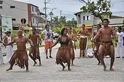 Maculele, a stick fighting dance from Santo Amaro, was introduced to a wider audience by Viva Bahia, a capoeira theater group founded in 1963.[1] Viva Bahia's founder, Emília Biancardi, had researched Bahian folklore for many years and integrated maculele into her group's performances. Major capoeira groups, such as those led by mestres Bimba, Pastinha, and Canjiquinha, soon adopted maculele as well.[1]