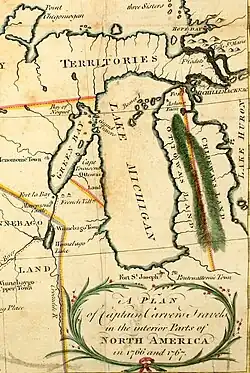 Louis negotiated for peace between Native Americans and the British after the end of the French and Indian War (1754–1763), when the French were defeated. Their relationship became complicated in the days leading up to the Revolutionary War and as Louis tried to thwart the British emergence in the fur trade in the area.[24] Louis planned a visit with Gros Loup to meet British Lieutenant Governor Henry Hamilton in Detroit in 1778.[25] Loup went with Hamilton during his August 6 to October 27, 1778 voyage along the upper Maumee River during the war.[26] Hamilton planned to stage an attack against St. Louis from St. Louis, but needed Native American allies to be successful.[24]