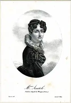 Mme Anatole was made première danseuse in 1822, her principal partner was Paul DeSchkane [Family name], with whom she made a triumphal tour to London in 1822. Her dance style was elegant and discrete, predisposing her to serious roles in ballets by Pierre Gardel, Jean-Pierre Aumer and Albert. Following Madame Anatole's three-month leave in London in January 1822, where her husband served as ballet master at the King's Theatre, the Académie Royale de Musique and the King's Theatre entered into an agreement to avoid hiring each other's dancers.[3] As ballet master, her husband Anatole chose Constance for the main role in Pandore, a ballet telling the tale of Pandora's box.[4] Constance performed in ballets with Albert who was also performing in London at the King's Theatre in 1822.[5] Upon her return to Paris, Paul and Lise Noblet took her place.[3] On 9 February 1828, Madame Anatole danced in Phyllis et Melibee.[6]