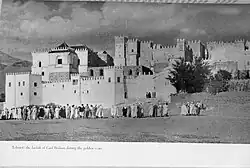 The same family had also constructed a lavish kasbah and fortified residence in Telouet, in the High Atlas, starting in 1860.[5] The family was originally from a place called Tigemmi n'Imezouaren in the territory of the Fatwaka tribe, near the Tassaout river.[6] His father was the qaid of Telouet, Mohammed Ou Hammou, known as Tibibit,[6] and his mother was Zouhra Oum El Khaïr, a black slave.[6] Mohammed Ou Hammou was one of the famous great lords of the south, about whom Eugène Aubin [7] coined the expression "Lords of the Atlas" which was taken up by Jérôme and Jean Tharaud,[8] and then by Gavin Maxwell.[9]