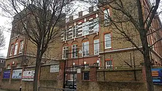 The main (southern) school building was originally occupied by Myrdle Street Central School. It was designed in 1905 by Thomas Jerram Bailey,[2] the Architect of the Education Department of the London County Council.[3] Myrdle Street was one of the first of the LCC's "central schools" that offered higher than elementary education. The building is described in the Pevsner Architectural Guide for London East as a "unique, outstanding design" featuring two semicircular staircase towers with copper domes.[2] It became a Grade II Listed building in 1973.[4]