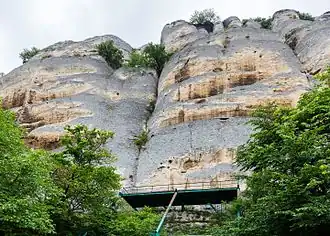 The relief sculpture depicts a majestic horseman, approximately 23 m (75 ft) above ground level, carved into an almost vertical 100 m-high (328 ft) cliff. The sculpture is almost life-size.[3] The horseman, facing right, is thrusting a spear into a lion lying at his horse's feet, and on the left a dog is running after the horseman.[5] The carving of the horseman's halo and garments, as well as the bird in front of the horseman's face, are barely recognizable due to centuries of erosion and the generally poor condition of the monument.[6] The relief is similar to the carbon images found in Saltovo, Soulek, Pliska and Veliki Preslav.[1]