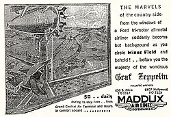 In February 1929 passenger service to Phoenix, Arizona began. Other local short-hop flights were also added. On August 26, 1929 a Maddux Tri-motor, along with other aircraft, escorted the famous LZ 127 Graf Zeppelin airship to Mines Field (now part of Los Angeles International Airport) where it stopped during its around the world flight.[2]