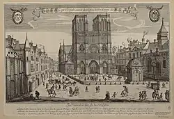 In preparation for the wedding, Francis I bought clothes and furnishings for Madeleine; jewels and gold chains were supplied by Regnault Danet, linen and cloths by Marie de Genevoise and Phillipe Savelon, clothes by the tailors Marceau Goursault and Charles Lacquait, veils by Jean Guesdon, and trimmings by Victor de Laval, who also made passementerie for a bed that Francis gave the couple. The goldsmith Thibault Hotman made silver plate for Madeleine.[10][11] The merchants of the royal "argenterie", René Tardif and Robert Fichepain supplied silks and woollen cloth.[12][13] A quantity of gold and silver trimmings for embroidering the clothes of Madeleine and her ladies were ordered from Baptiste Dalverge, a wire-drawer.[14] A platform walkway was constructed from the Bishop's Palace to Notre-Dame de Paris.[15]