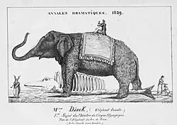D'Jeck first created a sensation in July 1829 in Paris, where she appeared at the Cirque Olympique of Antonio Franconi in a piece entitled l'éléphant du Roi de Siam (Elephant of the King of Siam) by Léopold Chandezon and Ferdinand Laloue.[1][2][3] She was then engaged, via menagerie owner Stephen Polito and Edward Cross, by Frederick Henry Yates of the Adelphi Theatre in London, where she debuted on December 3, 1829.[4][5] This play was titled The Elephant of Siam and the Fire Fiend and credited to Samuel Beazley and John Gallot (Gallott?),[6][7] though it may be largely a translation of the French play. D'Jeck remained at the Adelphi through early April before traveling around England. John Gallott was an actor at the Haymarket and Coburg Theatres, and ultimately became prompter at the old Adelphi.