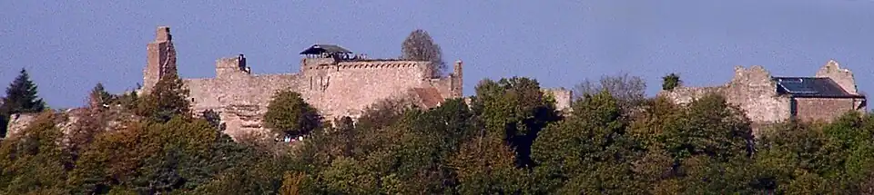 The ruin of Madenburg Castle is one of the biggest and oldest castle complexes in Rhineland-Palatinate, Germany. The castle was built on a cliff on the outskirts of the Palatinate Forest looking towards the Rhine rift valley. The ruin, which is surrounded by forest, lies at an elevation of 458 metres overlooking Eschbach.