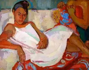 The majestic, explicitly Polynesian women that would figure in Mrs. Tennent's iconic imagery surfaced in works such as Reclining Girl (1929) and Three Filipino Ladies (1930), each a synthesis of European modernism's languid, architectonic femininity with Tennent's own racial fixation. Generously applying paint with a palette knife, she avoided sensuousness in the representation of skin texture, instead imbuing the trademark sense of strength and grandeur tinged with fragility apparent in Holoku Ball and Hawaiian Singer (early 1930s). Just as Mrs. Tennent constructed her wahine layer by layer in paint, she built her canvases to equally monumental proportions; when standard issue could no longer satisfy her vision, she sewed pieces of canvas together to attain the desired size.[8]: 100