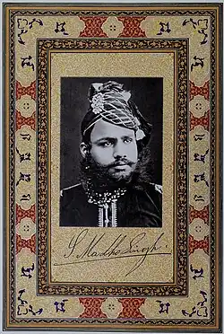 HH Saramad-e-Raja-e-Hindustan Raj-Rajeshwar Raj-Rajendra Maharajadhiraj Shri Maharaja Sawai Sir Madho Singh II (28 August 1862 – 7 September 1922), was the Maharaja of the Princely State of Jaipur from the year 1880 until 1922. He was the adopted son of the previous ruler Sawai Ram Singh II, Maharaja of Jaipur.[1]