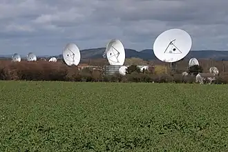The British Telecom's Madley Communications Centre is on part of the disused World War II airfield RAF Madley.[5] It was built in 1940 by Welsh contractors and opened as a training centre for aircrew and ground wireless operators on 27 August 1941. In 1943 the grass airfield was reinforced with Sommerfeld Tracking and the centre's population rose to about 5,000. The site was visited in 1944 prior to D-Day by US General George S. Patton, and later by Rudolf Hess (who had been held prisoner near Abergavenny) on his way to the Nuremberg trials in 1946. Today only a few hangars remain. On 1 August 2019 a Piper Arrow single engined aeroplane registered G-DIZY suffered an engine failure and made an emergency landing on the grass south of the runway intersections. It was later dismantled and removed by road.
