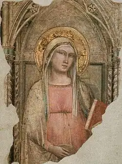 Notable examples include works by Taddeo Gaddi, Bernardo Daddi and Nardo di Cione, but the fresco by Piero della Francesca in the Museum of Monterchi, in the province of Arezzo, is considered the most famous one. The Madonna was portrayed standing, alone, often with a closed book on her stomach, an allusion to the Incarnate Word. These works were associated with the devotions of pregnant women, praying for a safe delivery.[1]