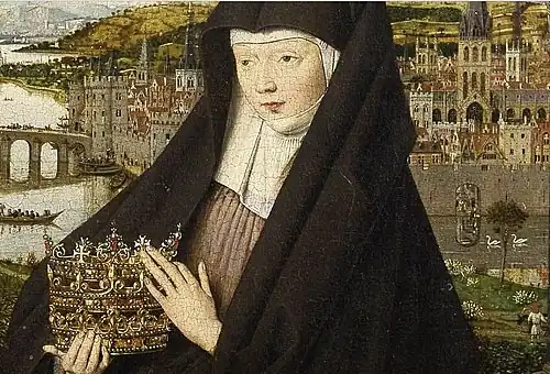 Mary stands in majesty, holding the child Christ and standing on an oriental carpet. Around her are Saint Barbara, standing before the tower in which she was prisoned, Saint Elizabeth of Hungary dressed in a nun's habit, and the donor Jan Vos (d. 1462), depicted as a Carthusian monk kneeling in prayer. A statue of the deity Mars can be seen through the window of Barbara's tower.[2] Vos' pose and modeling closely resembles the donors in both van Eyck's portraits of Nicolas Rolin in the Madonna of Chancellor Rolin and Joris van der Paele in the Virgin and Child with Canon van der Paele (the latter also contains a depiction of Saint Barbara). This fact, and the similarity of the landscape to that in a number of his earlier portraits has led to a general consensus among art historians that aspects of the panel are a pastiche of van Eyckian motifs, and that the painting was finished by a talented workshop member. Evidence suggests that the passages by van Eyck hand are mostly around the central Virgin and Child.[1]