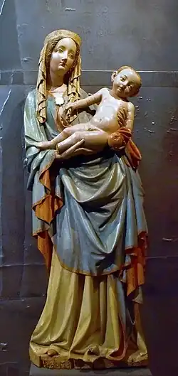 The Madonna of Nesvačily (around 1410) is one of the finest wooden beautiful madonnas of the late beautiful style in Bohemia. It is considered a younger replica of the Madonna of Plzeň. The so-called Master of the Nesvačily sculptures, who was probably trained in the workshop of the Master of the Týn Calvary, has been identified as the author. The statue comes from the Church of the Finding of the Holy Cross in Nesvačily and is on display in the exposition of medieval art of the National Gallery in Prague.[1]