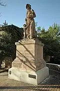 Dedicated in 1929, the Madonna of the Trail is one of twelve identical statues placed in twelve states by the National Society of the Daughters of the American Revolution. The statues, differentiated by the inscriptions on their bases, commemorate the westward move of American civilization on a series of trails, which eventually linked the country from the Atlantic to the Pacific. They especially pay tribute to the importance of a national highway and the role of pioneer women. The statue was designed by German-born architectural sculptor August Leimbach and inspired by a statue of Sacagawea in Portland, Oregon. The Upland monument is said to represent four historic trails: the Mojave Trail, the de Anza Trail, the Emigrant Trail, and the Canyon Road. [10] |