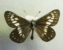 Adult butterflies emerge from their nests through the small exits while they are still teneral. Their escape is facilitated by soft, pliable wings. The wings also have an atypical shape and venation patterns adapted to escape the nest. The adults have black and white coloration on the wings, and the pattern is more prominent on the males. The males also are usually much paler and smaller than the females.[4] The males have larger eyes and higher wing venation as compared to the females. The proboscis does not anneal properly post-eclosion and is non-functional.[3][8]