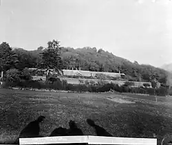 The modern castle was sold at auction with its art collection in 1910, with George Frederick Cunningham Yale as one of its trustees.[12][13] Content of the castle included works by Anthony Van Dyck, John Hoppner, Hans Holbein and Thomas Gainsborough.[14][6] Some items went to the Royal Collection at Windsor Castle, and portraits included those of Henry VII, the young Elizabeth Tudor and Mary Queen of Scots.[6] The estate was acquired by Caernarfonshire County Council.[15] Madryn Castle Gatehouse, also known as the Tudor Gatehouse, is now a grade II listed building in Wales under Cadw, and is the last remains of the past Tudor castle. The castle was demolished in 1968 after a fire, and a holiday park was built within the estate.[16][1][17]