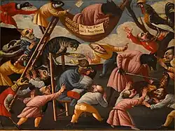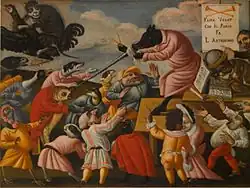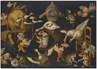 The persons and animals in the compositions engage in disorganised actions and reactions. The compositions are full of absurd and grotesque elements and it is often difficult to make out what exactly is going on.[3] The master’s raucous style appears to constitute some form of 'moral zoology'. The absurd characters are possibly intended to show the madness of the human condition, and the vanity and ridiculousness of life.[2]