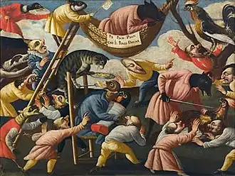 The paintings usually include a banner with a mysterious saying that purportedly explains the subject of the composition. Of a pair of paintings sold at Sotheby’s (27–29 January 2005, New York, lot 369A) one is inscribed Son Capporal Dei Matti Ch osseruo beni patti (I am corporal of the fools that well observes the rules) while the other is inscribed Assai Ben Balla A chi fortuna Suona (He dances well enough who fortune plays for).[1]