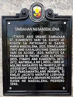 Magdalena was formerly known as Ambling, a barrio of Majayjay until it was elevated as a town in 1821.[1][2] The first church, made of cogon and wood was constructed in 1820 and was dedicated to Mary Magdalene. Antonio Moreno was appointed at its first parish priest in 1821.[2] A permission to build a stone church was ordered by Captain Pablo de la Concepción in 1829.[1] To obtain funds for the church, the people were forced to pay taxes and quarry sand and stones from the river. The construction of the church building was halted in 1839, continued in 1849 and finished in 1855 under the direction of Maximo Rico, Jose Cuesta, Joaquin de Coria and Francisco de Paula Gonzalez.[1][3] Construction of the belltower was finished in 1861.[1]