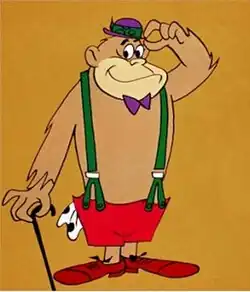 Like many of Hanna-Barbera's animal characters, Magilla Gorilla sported human accessories: a purple bow tie, red shorts held up by green suspenders, a purple undersized derby hat, and brown dress shoes.[2]