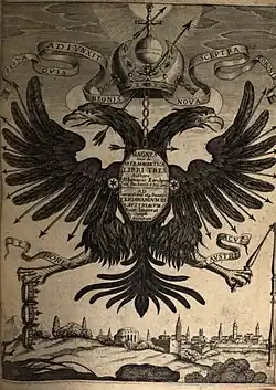 The frontispiece of the first edition is by Claudio Dagli. It depicts the double-headed imperial eagle of the Hapsburg dynasty. It hangs by a magnetised chain from the imperial crown that supports an orb and a cross. Both the crown and the cross are struck through with magnetised arrows pointing towards a heavenly source, but not directly at the all-seeing eye of god directly above - perhaps a reference to magnetic declination.[5]: 23 In one of its claws the eagle holds the crowns of Austria, Hungry and Bohemia, held together by magnetism, while in the other it holds the sceptres of the three realms, similarly linked by magnetic force. Arrows from the bird's outstretched wings project imperial power to the lands below.[18] A lodestone on the eagle's breast carries the dedication to Emperor Ferdinand III and a banner above the eagle's head carries the Latin motto Regna Quis Adiunxit Regnis Nova Sceptra Coronis ("He has added kingdoms to kingdoms and new sceptres to crowns"). A second banner curling around its feet carries the Latin pun Et Boreae Et Austri-Acus (""Needle of the north and south - 'austriacus' also meaning 'Austrian').[5]: 23 In the third edition the dedication to Ferdinand III is replaced on the breast of the eagle by his portrait.[5]: 23