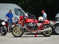 Magni wanted to produce an "all Italian" machine and turned to Moto Guzzi for a supply of engines. The first Guzzi engined machine was the Magni-Guzzi LeMans 1000, using the engine from the Le Mans 1000. A new frame was designed, which had similarities to the Lino Tonti designed Moto Guzzi item. Magni introduced the "parallelogram" rear suspension,[33] previously used on the 1950 shaft drive MV Agusta 500 cc GP machines,[35] which negated the torque reactions of the shaft drive and made the handling more predictable.[30][36] (A parallelogram kit was made available to upgrade the rear suspension of Moto Guzzi models)[37]