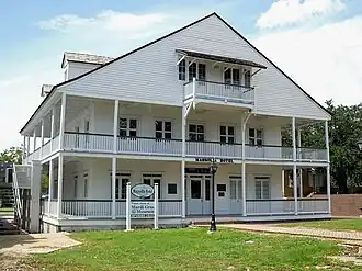 The Magnolia Hotel was constructed for John Hahn, who operated a coffeehouse in New Orleans.[5] Originally, the hotel was a 2+1⁄2-story, wood-frame building with plastered exterior walls that measured 54 feet (16 m) on each side. The exterior walls were recessed 7 feet (2.1 m). A central hall extended front to back on both floors. The first floor had paired rooms on either side of the hall; the second floor hall had six rooms on either side. The hotel was originally located near the beach, facing south, toward the Mississippi Sound.[6]