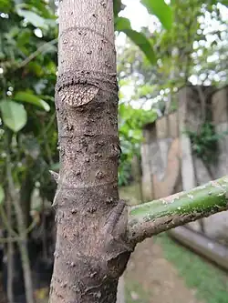 They are trees reaching up to 35 m height and 100 cm in diameter. Leaves alternate, simple, spirally arranged, coriaceous, elliptic, measuring from 11 to 26 cm long and from 7,4 to 12 cm wide; petiole greatly thickened at the base and present a scar that cover it completely. Flowers have cream color, two bracts up to 5 cm long covering the flower bud; three sepals and seven petals. The fruits are subglobose to ovoid, large, up to 16 cm long; 1-2 seeds per carpel with red cover.[1][2]