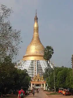 The relics arrived in 1576.[4] In 1599, King Anaukpetlun conquered Bago and removed the relics to Taungoo.[4] In 1636, King Thalun removed the relics to Inwa, enshrining them at the Kaunghmudaw Pagoda in Sagaing.[4] Throughout its history, the pagoda has been destroyed by several earthquakes along the Sagaing Fault, on 13 September 1564, 1583, and 8 October 1888, and completely leveled in 1930.[7][3] Mahazedi Pagoda was rebuilt in the 1950s.[6]