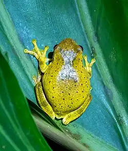 The adult male frog measures 33 to 45 mm in snout-vent length and the adult female frog 38 to 47 mm. This frog has webbed skin on all four feet. This frog has bright yellow color on its back and some bright red near its vent and sides. This frog can change color, appearing yellow and orange at night and almost white during the day. This frog is nocturnal.[3]