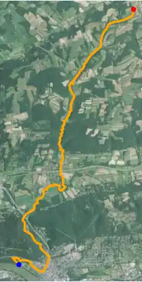Satellite map of Mahoning Creek. The red dot is the stream's source and blue dot is its mouth. | |