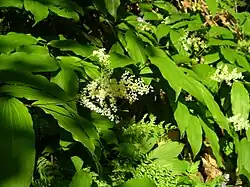 Maianthemum includes the former genus Smilacina and is a genus of perennial herbaceous flowering plants with fleshy, persistent rhizomes. It is widespread across much of North America, Europe and Asia,[1][2][3][4] and may be terrestrial, aquatic or epiphytic.[4] It is characterized by simple, unbranched stems that are upright, leaning or hanging down and have 2–17 foliage leaves. Leaves are simple and may clasp the stem or be short-petiolate. The inflorescence is terminal and either a panicle or a raceme with few to many pedicelate flowers. Most species have 6 tepals and 6 stamens; a few have parts in 4s. Tepals are distinct in most species and all of similar size. Flowers are spreading, cup-shaped or bell-shaped and usually white, but lavender to red or green in some species. Fruits are rounded to lobed berries containing few to several seeds.
