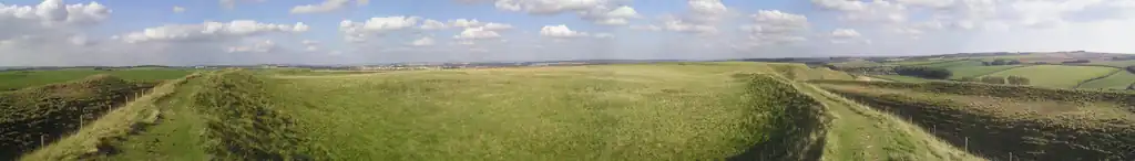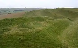 Constructed on a territorial boundary in about 600 BC, the first hill fort at Maiden Castle was a 6.4 ha (16-acre) area surrounded by a single ditch.[20] The hill it sits on is part of a ridge on the north side of the South Winterborne valley, which feeds the River Frome. At the eastern end of the ridge and rising 132 m (433 ft) above sea level, the site of the first hill fort was not the highest point along the ridge. The highest point is the neighbouring Hog Hill, which is only 1 m (3.3 ft) higher.[21] The hill projects about 40 m (131 ft) above the surrounding countryside, which is about 90 m (295 ft) above sea level.[22] The defences were 8.4 m (28 ft) high and consisted of the V-shaped ditch and a rampart.[20] The rampart would probably have been timber-faced around just the entrances. Elaborate timber facing would have been used to impress visitors.[23] The site could be accessed by an entrance in the northwest and a double entrance in the east. The double entrance is unique in hill forts in the British Isles. The reason for a double entrance is unclear; however, archaeologist Niall Sharples has suggested that it was a form of segregation. It is likely that several farming communities lived in the hill fort and wanted different entrances.[20]