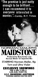 Maidstone is a 1970 American independent drama film written, produced and directed by Norman Mailer. It stars Mailer, Rip Torn and Ultra Violet. The film concerns famous film director Norman Kingsley, who runs for president while a group of friends, relatives, employees and lobbyists gather to discuss possible assassination plots against him.[1] While producing his latest film about a brothel, Kingsley's brother Raoul continues to cling to him for his money.