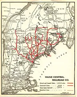 The Maine Central Railroad (reporting mark MEC) was a U. S. class 1 railroad[2] in central and southern Maine. It was chartered in 1856 and began operations in 1862. By 1884, Maine Central was the longest railroad in New England. Maine Central had expanded to 1,358 miles (2,185 km) when the United States Railroad Administration assumed control in 1917. The main line extended from South Portland, Maine, east to the Canada–United States border with New Brunswick, and a Mountain Division extended west from Portland to St. Johnsbury, Vermont, and north into Quebec. The main line was double track from South Portland to Royal Junction, where it split into a "lower road" through Brunswick and Augusta and a "back road" through Lewiston, which converged at Waterville into single track to Bangor and points east. Branch lines served the industrial center of Rumford, a resort hotel on Moosehead Lake and coastal communities from Bath to Eastport.[3]