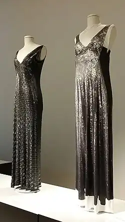 The house produces both artisanal collections and ready-to-wear collections, with the former inspiring the designs of the latter.[3] With formal allegiance to no particular fashion movement,[19] Maison Margiela's designs are famous for deconstructionist traits[13] such as exposed seams, being oversized and upcycling garments.[47] Other deconstructionist tactics Maison Margiela has utilized include using traditional fabric linings as the outer layers of garments,[18] and the label's 1988 debut womenswear collection[2] included what The Independent described as "a leather butcher's apron reworked into a seductive evening gown," and an old tulle dress worked into several tailored jackets.[18] Other work with unconventional materials has included clothes fashioned of plastic carrier bags and wire coat hangers,[7] trouser suits made from 1970s upholstery fabrics, tops made with leather gloves, and jewelry made of colored ice such that clothes are dyed as the jewelry melts.[2]