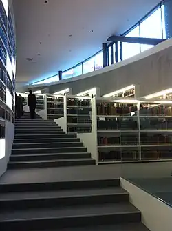 The Maison de la paix is home to the Davis Library, named after alumna and benefactor Kathryn Wasserman Davis and her husband Shelby Cullom Davis. The library hosts 350,000 physical volumes dedicated to the Graduate Institute's areas of study in international and development studies.[9]