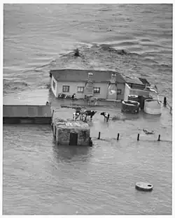The 1940s and 1950s saw an increase in rainfall and the river rose again and again.[24] In February 1955, Maitland and the Hunter Valley experienced its most severe flood in recorded history. The 1955 Hunter Valley floods, also commonly known as "The Maitland Flood", was the first Australian natural disaster to be broadcast by the media on an international scale.[24] This flood is considered to be one of Australia's worst floods.[25] The waters reached 12.5 m (41 ft) and caused catastrophic damage and loss of life. The volume of flood water was approximately 3,750,000 megalitres (8.2×1011 imp gal) and the cost of damage, in today's currency, would have been over A$2 billion. Seven thousand buildings and homes were damaged and the flood claimed the lives of 14 people.