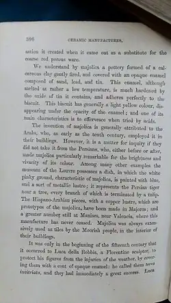 - ^ Arthur Beckwith, 1877, Majolica and Fayence, Italian, Sicilian, Majorcan, Hispano-Moresque and Persian, D. Appleton and Company, New York, Meaning of Majolica, p. 23: "The introduction of a stanniferious enamel [tin-glaze] to Italy occurred previous to its use by Luca della Robbia [...]. Previous to that we find it used in Spain and Majorca..."