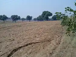 | Arid soil | Arid soils range from red to brown in colour. They are generally sandy in texture and saline in nature. In some areas the salt content is very high and common salt is obtained by evaporating the water. Due to the dry climate, high temperature, evaporation is faster and the soil lacks organic matter and moisture which is the raw material needed for humus. The lower horizons of the soil are occupied by Kankar because of the increasing calcium content downwards. The Kankar layer formations in the bottom horizons restrict the infiltration of water. After proper irrigation these soils become cultivable as has been in the case of western Rajasthan. | ![]() |