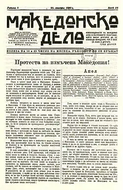 Makedonsko delo (Bulgarian/Macedonian:Македонско дело, lit.:"Macedonian cause") was a newspaper connected to the IMRO (United) and came out on the 10th and 25th of each month in Bulgarian language. It was printed in Berlin, Vienna, and Paris. The newspaper started on September 10, 1925, and had notable people in the editorial committee like Dimitar Vlahov, Vladimir Poptomov, and Pavel Shatev.[1] In total, 179 issues were published,[2] with the last one on May 25, 1935.