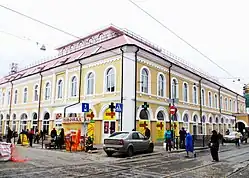The building is located at the intersection of Stanislavsky Street and Semashko Lane. The main facade faces the Cathedral of the Nativity of the Theotokos. The building is built in traditions of late classicism. The window openings of the ground and second floor have semi-circular ends. A cornice with an arcature belt completes the decor of the facades. The central part of the main facade is highlighted by a mezzanine with a number of small arch windows.[7]