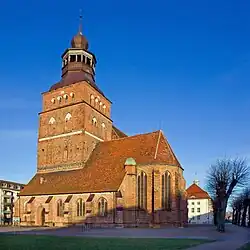 It offers some notable landmarks, such as two Brick Gothic town gates, a medieval defense tower, the Gothic town church of St. John and the Neo Baroque town hall.