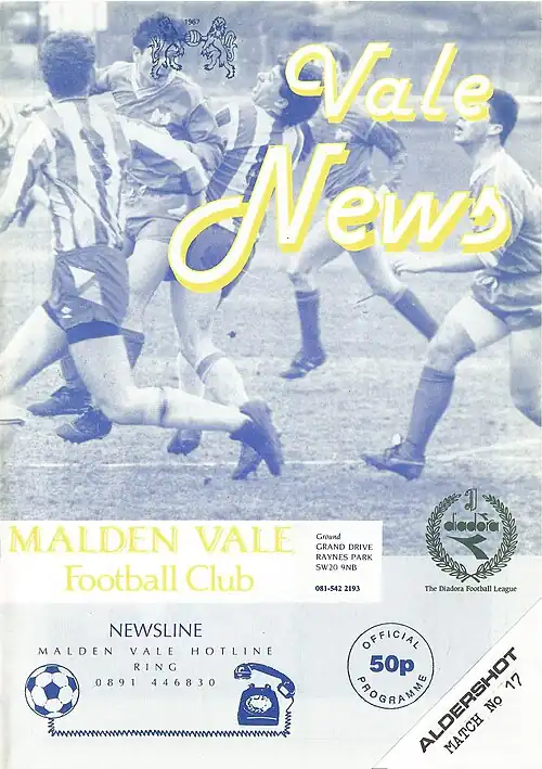The club spent its last five seasons in the Diadora League. At the end of the 1993–94 season, managers Mick Brown and Ged Murphy left the club to join Hendon, unfortunately most of the players went with them. The final season saw Malden Vale at the foot of the table, although a marked improvement came when Steve Smith and Lee Dobinson took over as managers, Malden Vale still finished bottom.