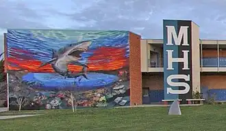 Malibu High School athletic teams are nicknamed the Sharks, and the mascot, a grinning Mako shark, was designed by an art student in the first graduating class of 1996. The school is a charter member of the Citrus Coast League, a conference within the CIF Southern Section that was established in 2018. Prior to that, Malibu was part of the Tri-County Athletic Association.[26] A study published in 2007 by the MHS Site Governance Council reported that 75% of all honors and AP enrolled students participate in the school's sports programs.[27]